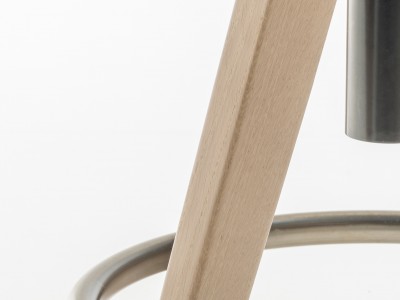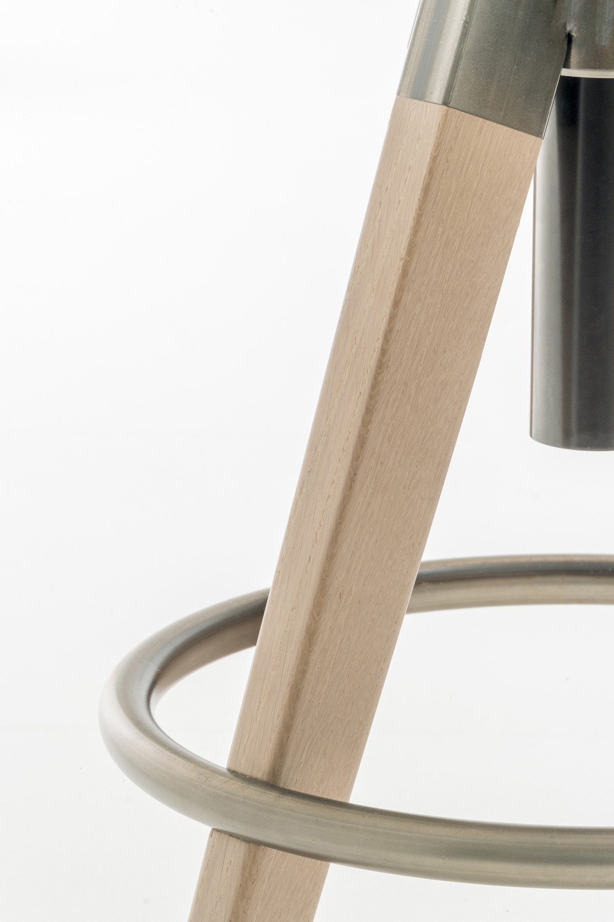 - Ein Fußring aus Edelstahl umfaßt die Füße und stiftet einen angenehmen Kontrast mit der Natürlichkeit des Holzes.