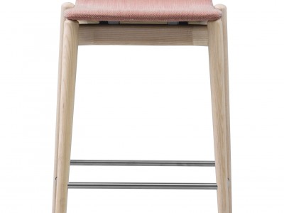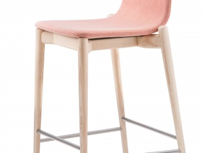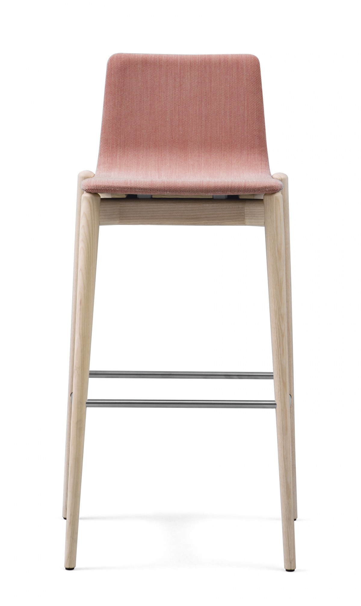 - Die Struktur des Barstuhls besteht im Kern aus Eschenholz – gebleicht, schwarz, grau gefärbt, die Sitzschale aus Schichtholz ist mit Stoff bezogen.