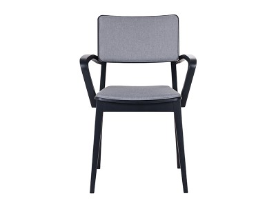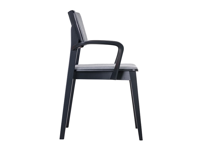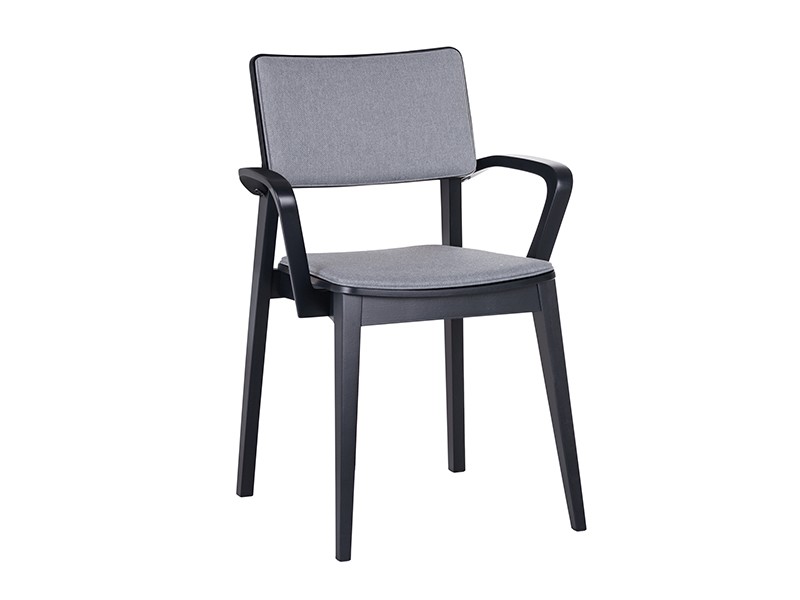 - Gepolsterter Holzstuhl mit Armlehnen.