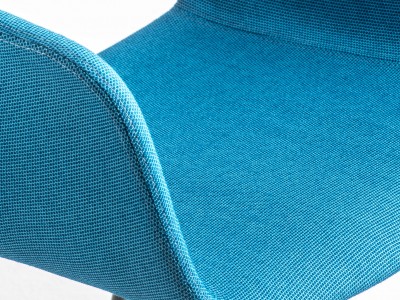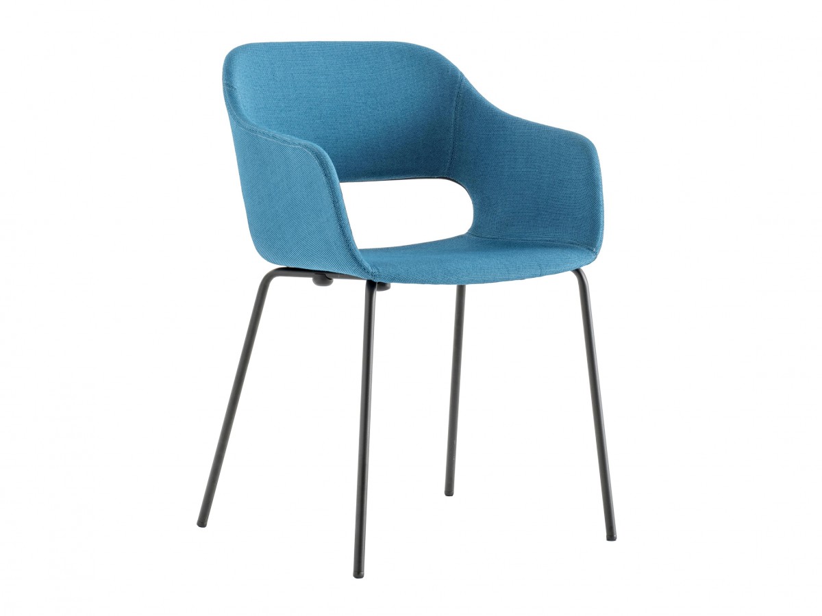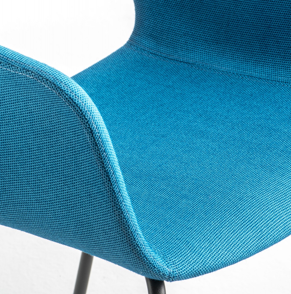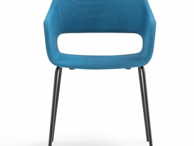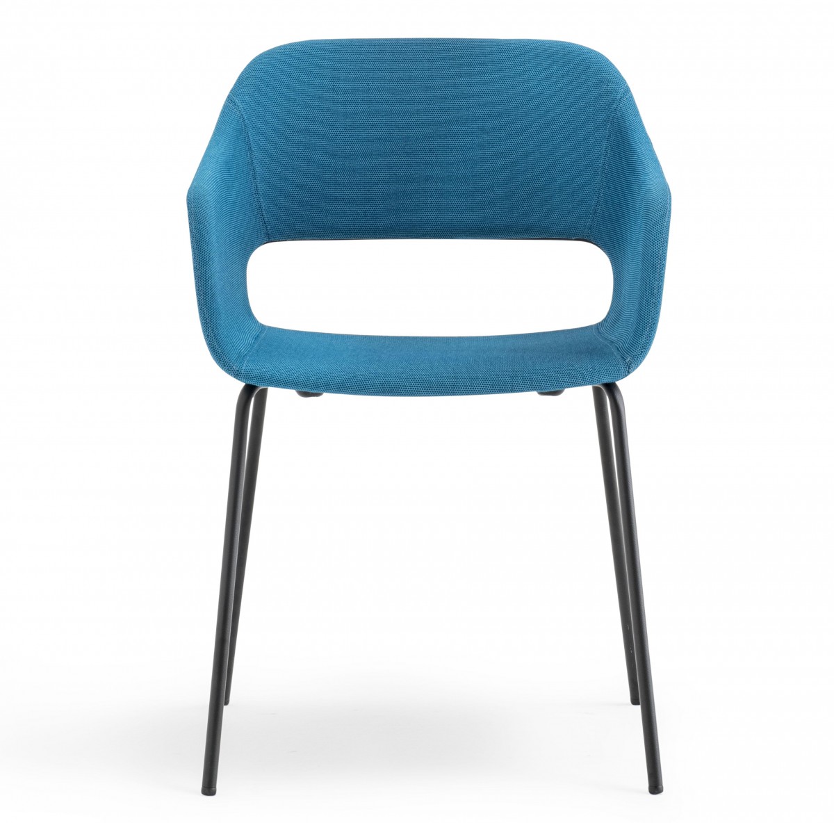 - Armlehnstuhll mit gepolsterter Sitzschale, bezogen mit Stoff oder Kunstleder und Gestell aus Edelstahl-Rohr Ø16 mm.