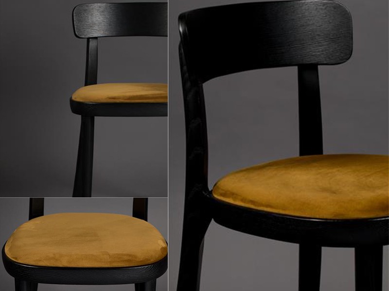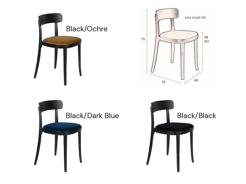 - Der Sitz ist mit 100% Polyester-Samtstoff bezogen und in Ocker, Dunkelblau oder Schwarz erhältlich.