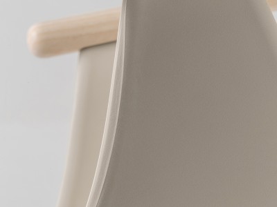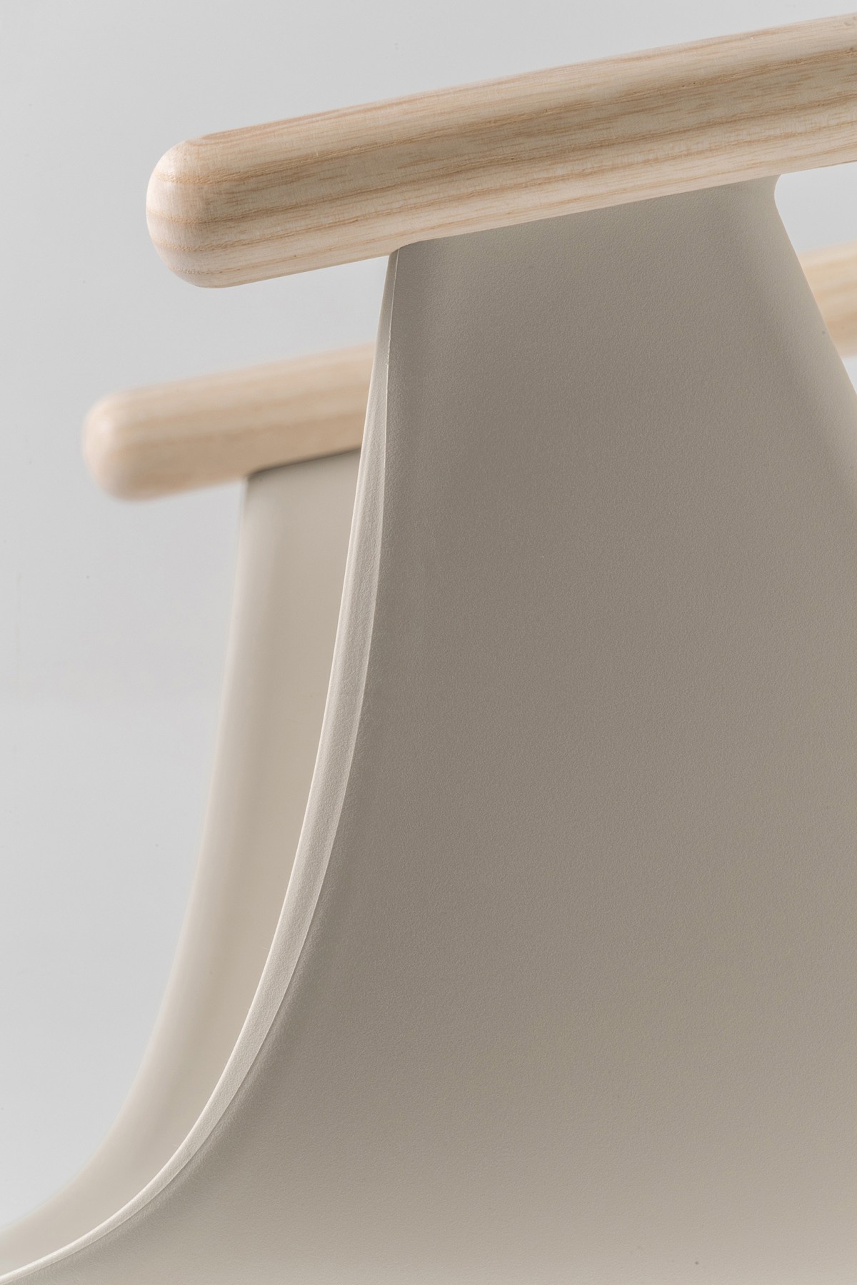 - Eine schablonierte, dünne Schale aus Polypropylen mit Glasfasern verstärkt, ist in einem Profil aus Esche eingebaut, an die Extremitäten gekrümmt und abgerundet, wie eine Umarmung.
