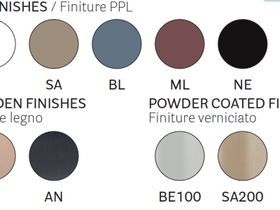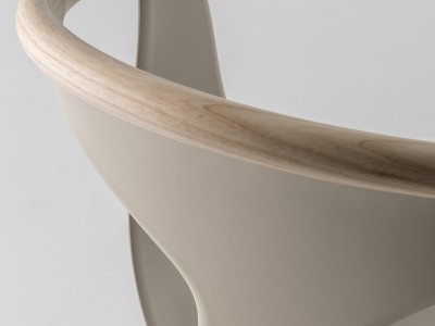 - Eine schablonierte, dünne Schale aus Polypropylen mit Glasfasern verstärkt, ist in einem Profil aus Esche eingebaut, an die Extremitäten gekrümmt und abgerundet, wie eine Umarmung.