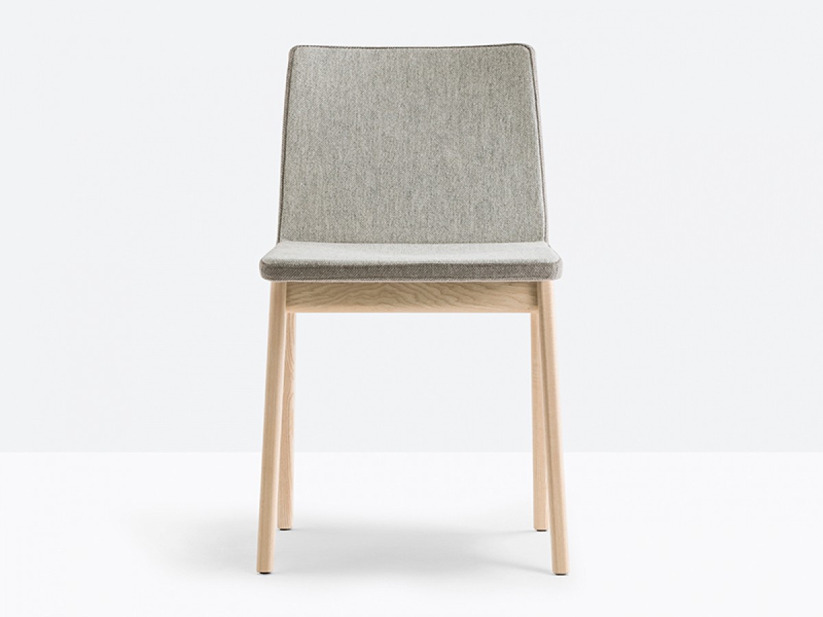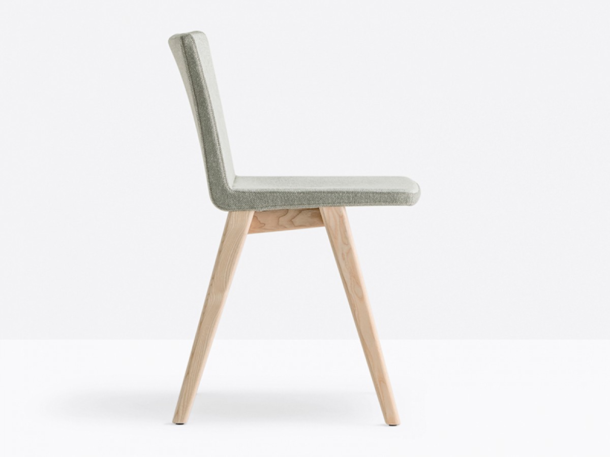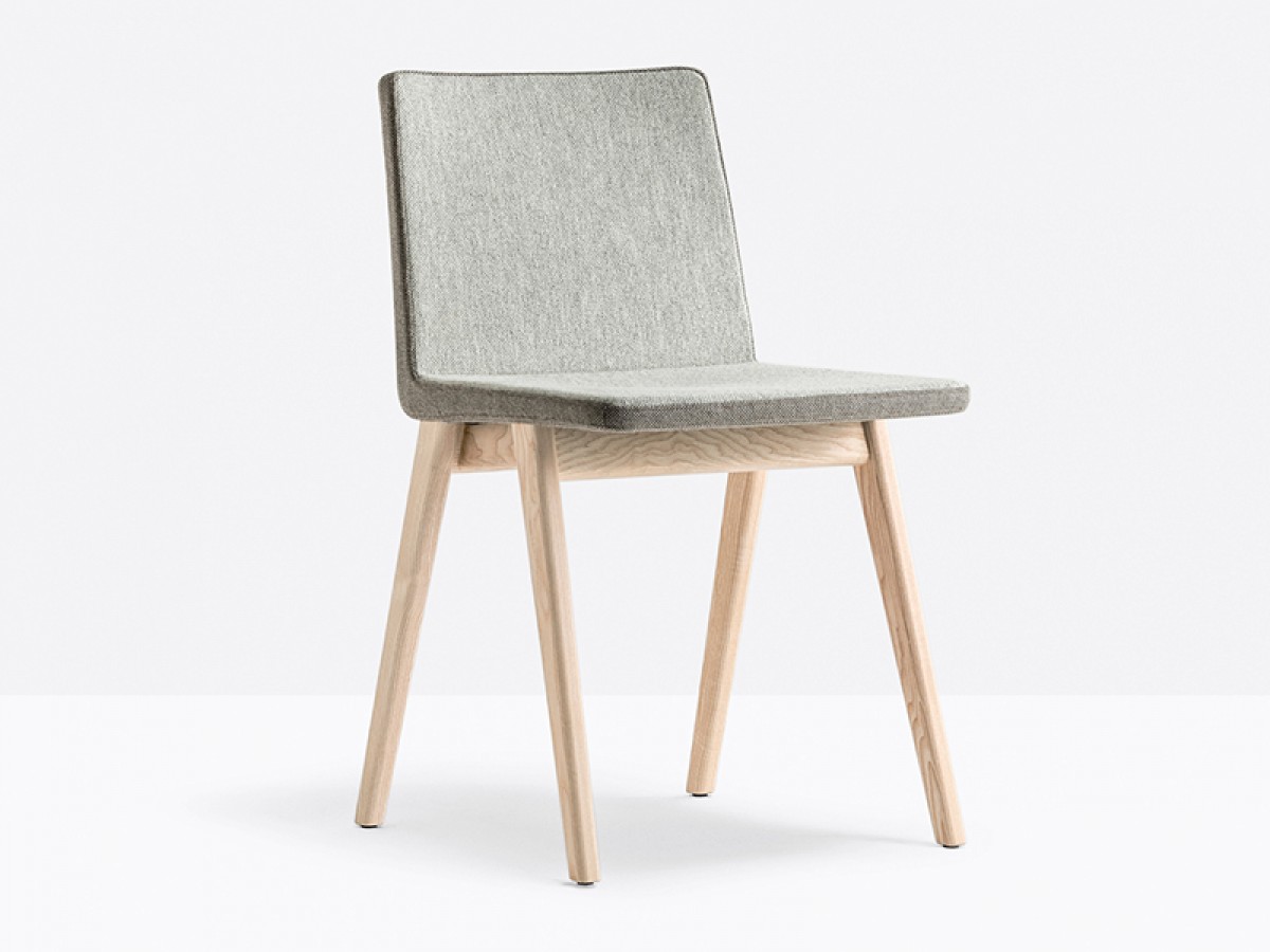 - Stuhl mit gepolsterter Schale, bezogen mit Stoff oder Leder und Gestell aus massivem Eschenholz.