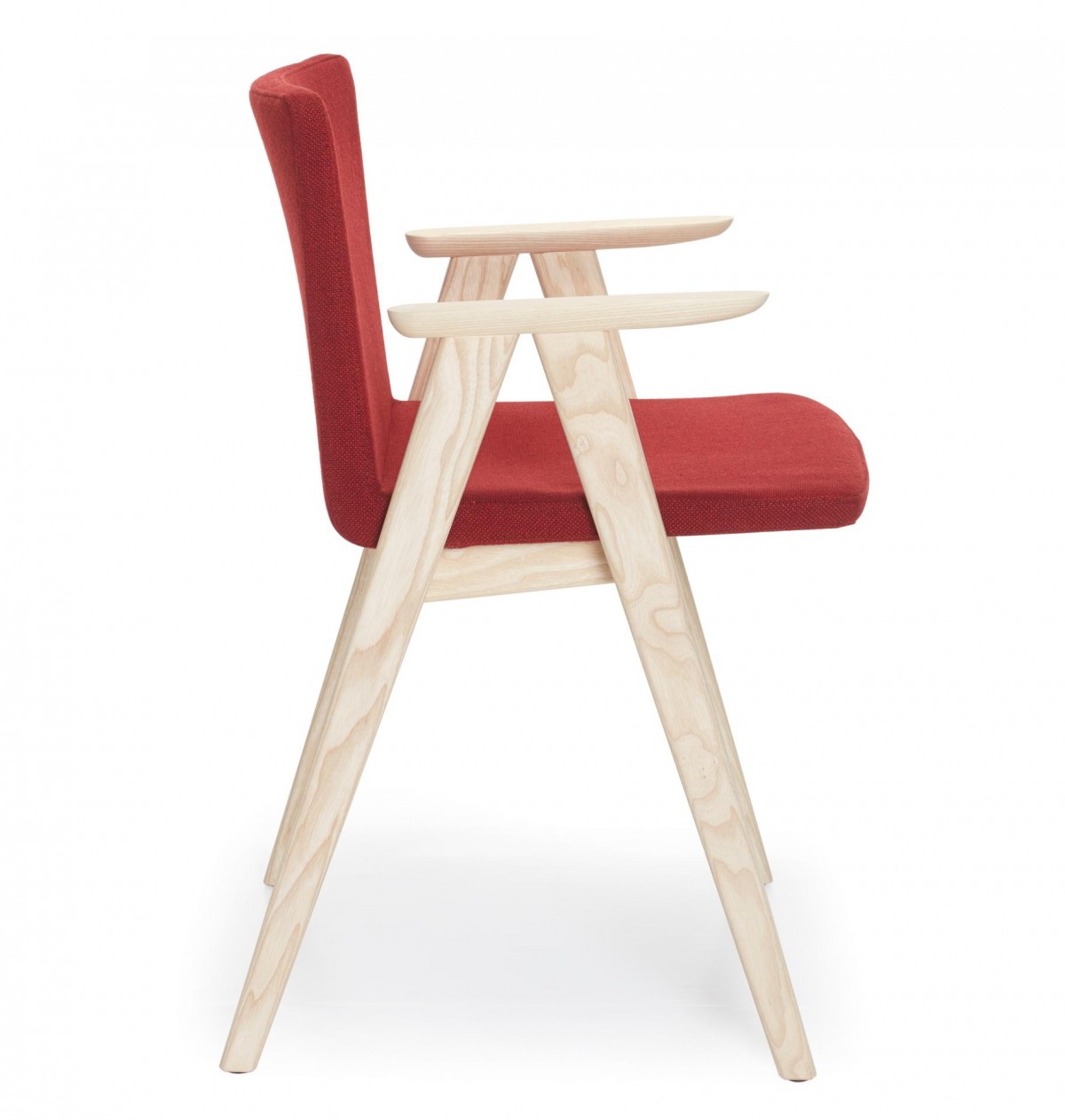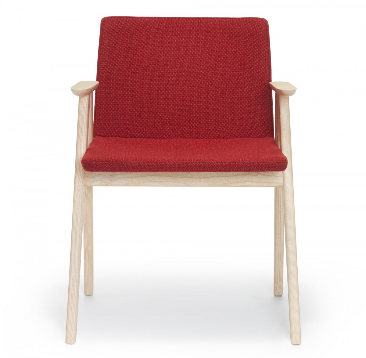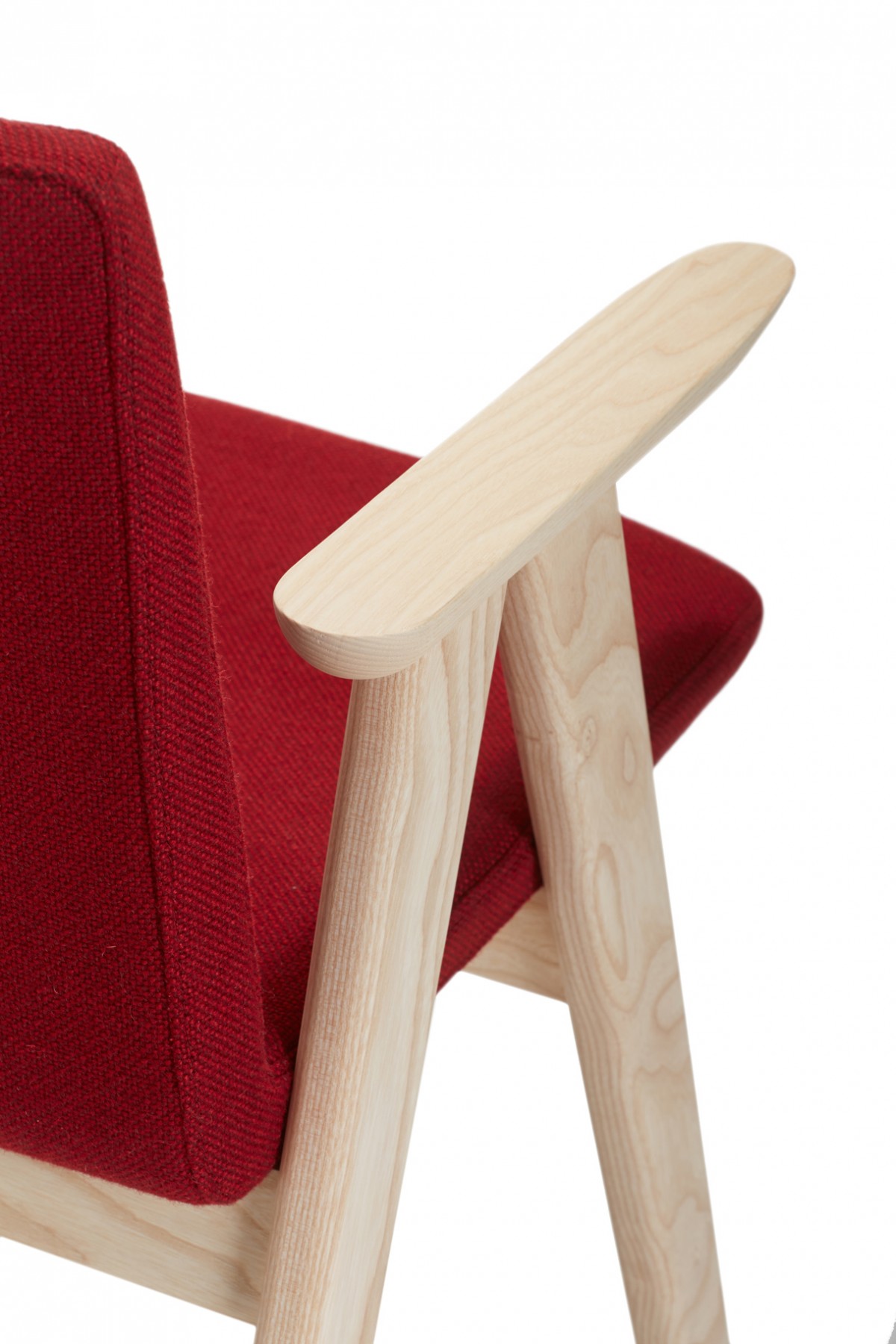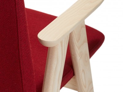 - Sessel mit gepolsterter Schale, Bezug aus Stoff oder Leder, Gestell aus massivem Eschenholz und Armlehnen.
