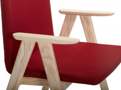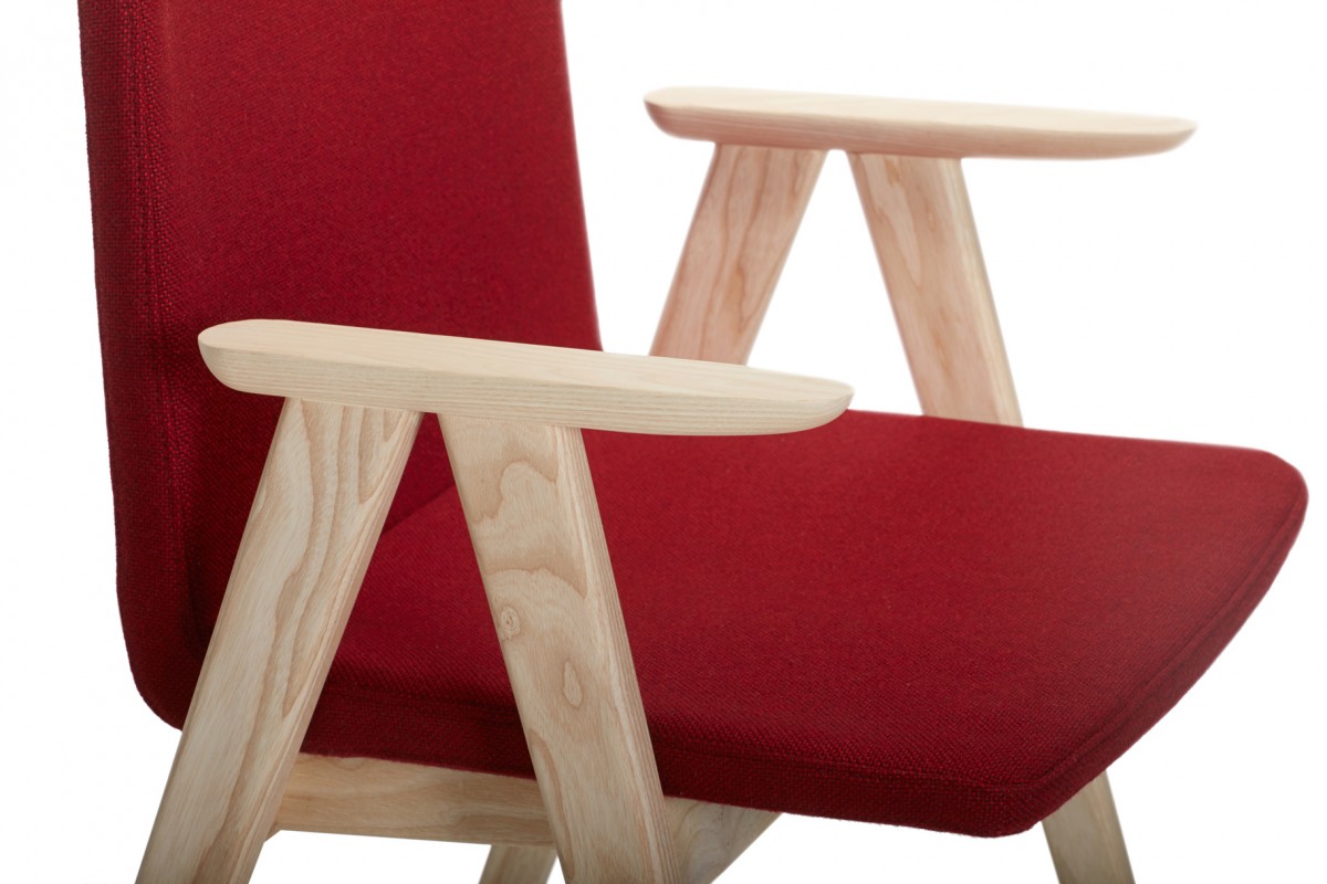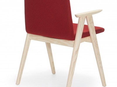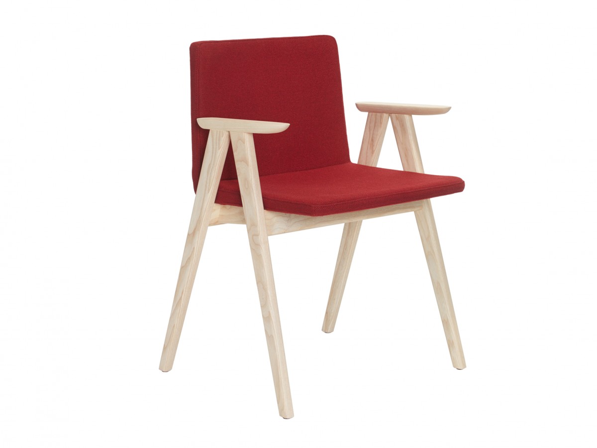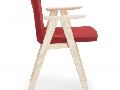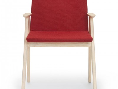 - Sessel mit gepolsterter Schale, Bezug aus Stoff oder Leder, Gestell aus massivem Eschenholz und Armlehnen.
