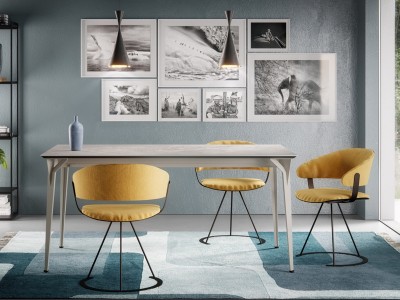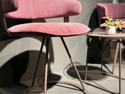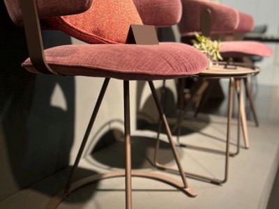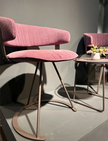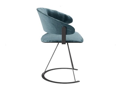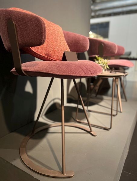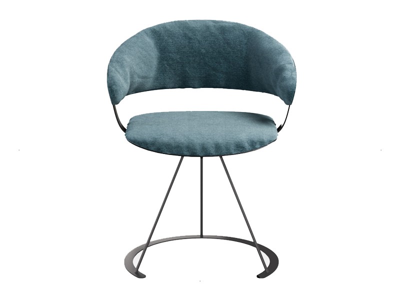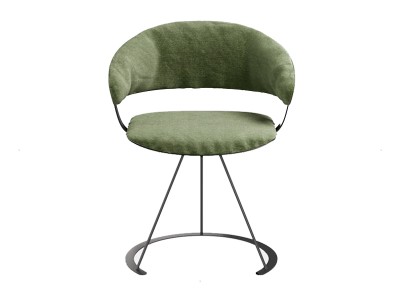 - Stuhl mit dreibeinigem Stahlgestell, Sitz und Rückenlehne mit Stoff bezogen, in verschiedenen Farben erhältlich.