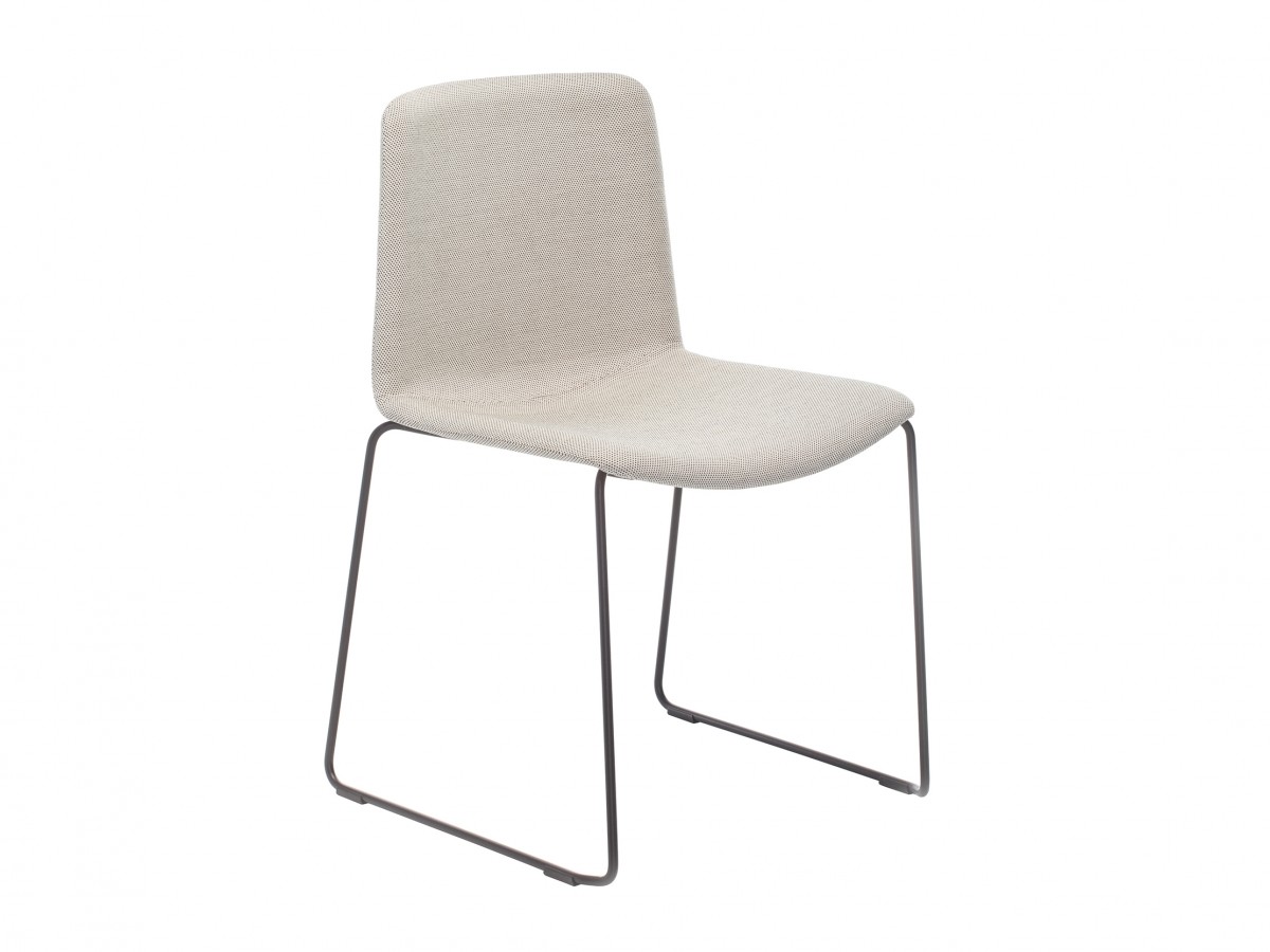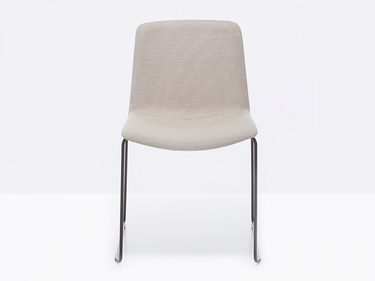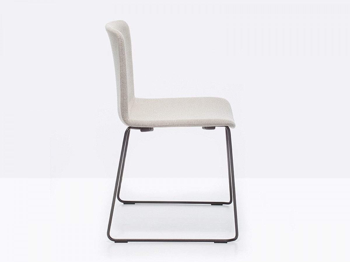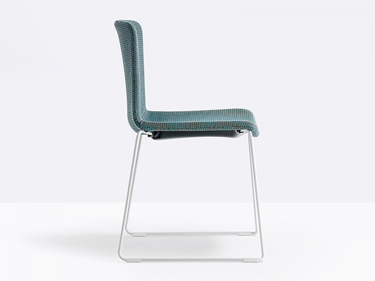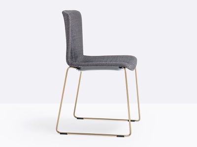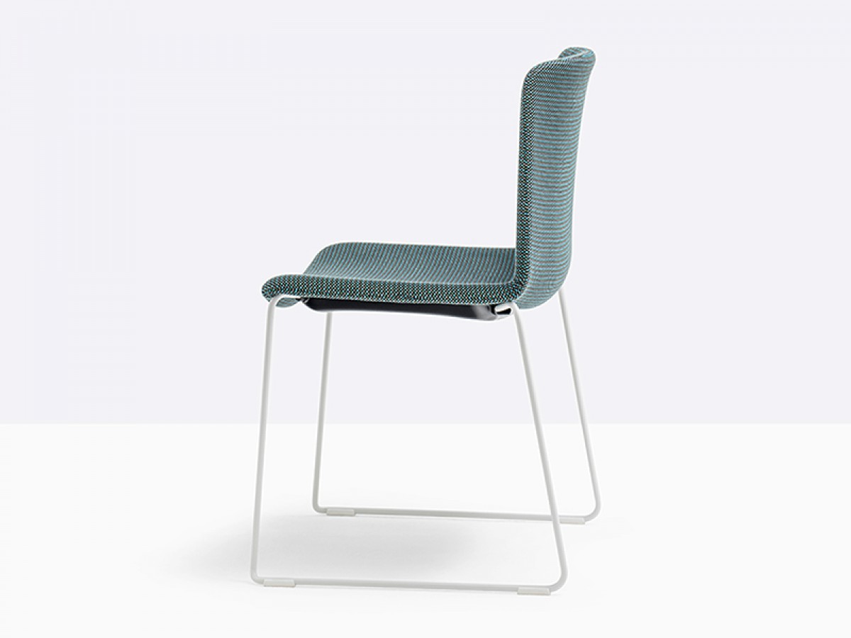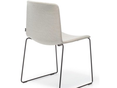 - Der Tweet Soft Stuhl, stapelbar, hat eine gepolsterte Schale aus Stoff oder Kunstleder und eine Schlitten-Struktur aus Stahlrohr Ø11 mm.