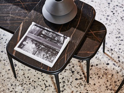 - Kaffeetisch Lea mit einem stabilen vierbeinigen Untergestell aus lackiertem Metall. Die Platte dieses Kaffeetischs ist wahlweise aus Holz oder Keramik erhältlich und bietet so eine Reihe von Optionen, die Ihrer gewünschten Ästhetik und Funktionalität entsprechen.