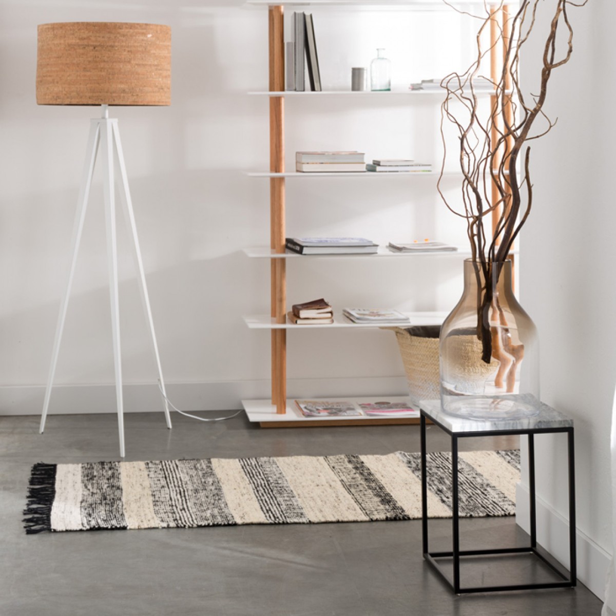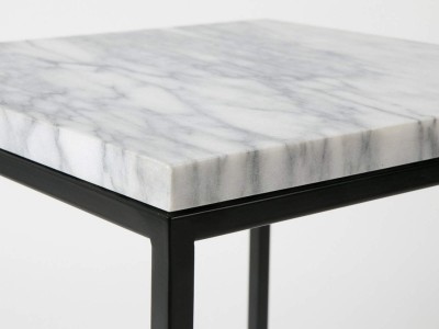 - Beistelltisch mit Stahlwürfelrahmen und weißer Marmortischplatte.
