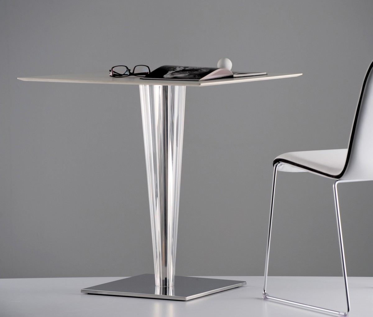 - Säule aus Methacrylat, durchsichtig, glänzend schwarz oder glänzend weiß. Innere Edelstahsäule.