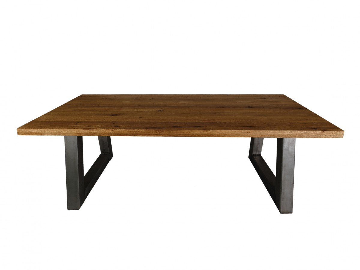 - Tisch mit 2.8 cm Eichenplatte und Trapezfuß aus Stahl (10x10)