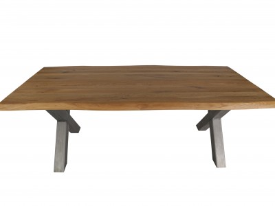 - Die Tischplatte besteht aus gehobelten rustikalen Eichendielen. Die Basis besteht aus unbehandeltem Stahl. Es ist eine sehr robuste und stabile Basis in Form eines X.