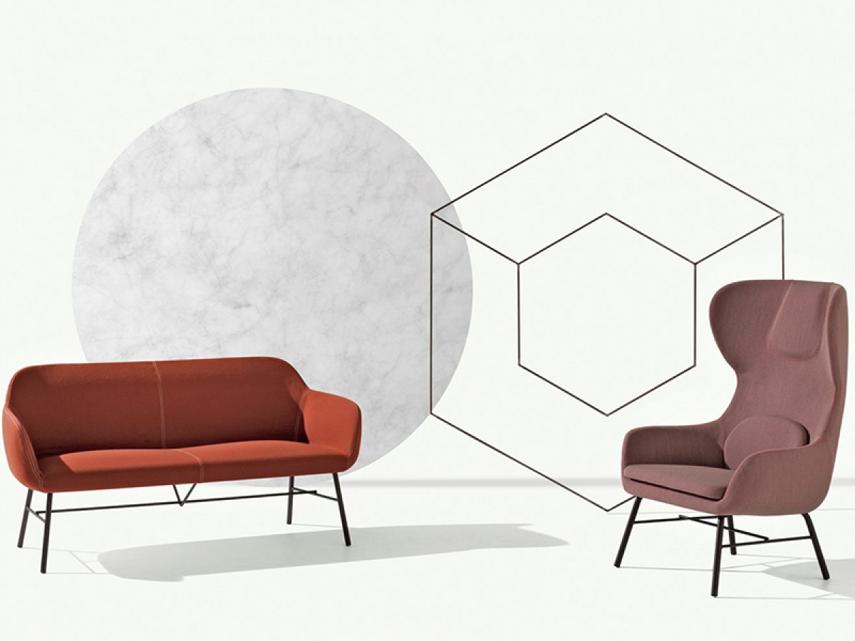 - Sofa mit 4-beinigem Stahlgestell. Gepolsterte Sitzfläche und Rückenlehne.