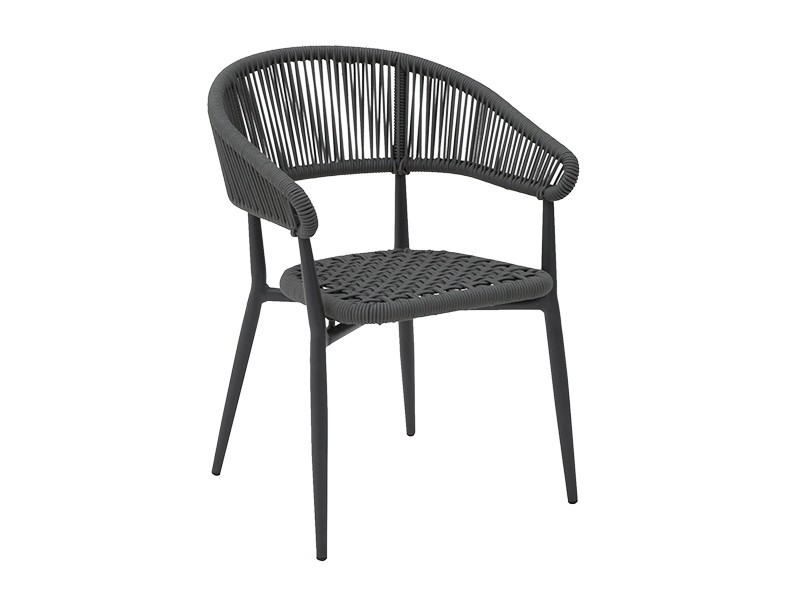 - Sein Aluminiumrahmen ist fachmännisch in einem raffinierten sandfarbenen Dunkelgrau pulverbeschichtet, während die Sitzfläche und die Rückenlehne mit einem kunstvoll geflochtenen grauen Seil versehen sind.