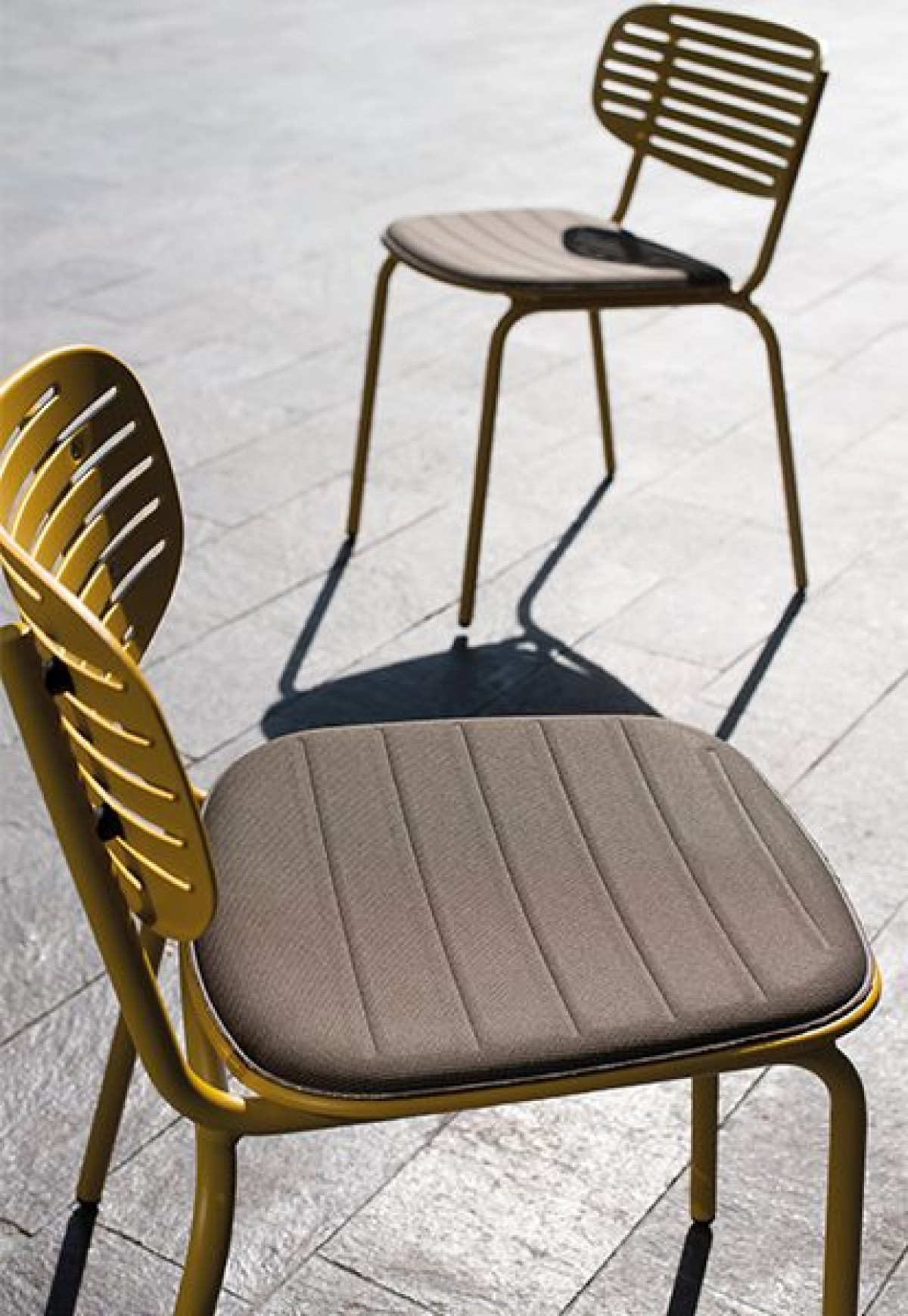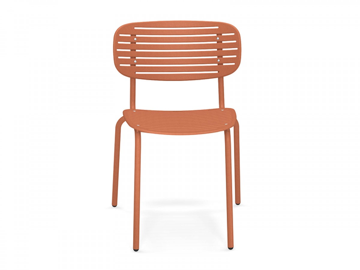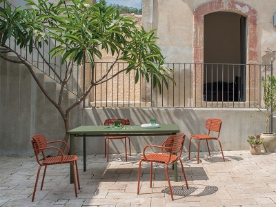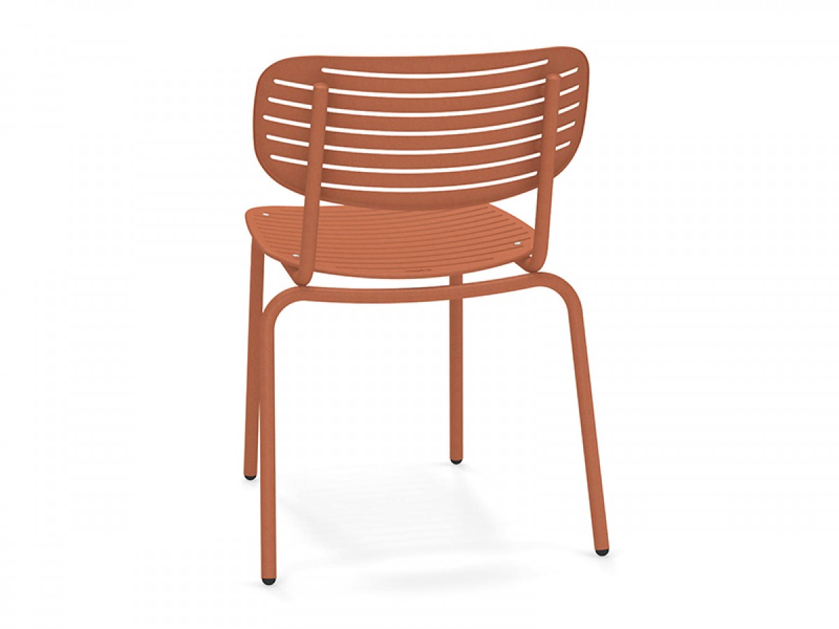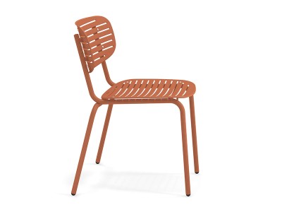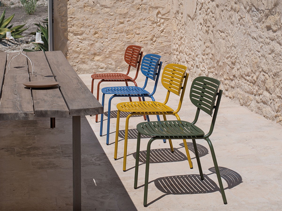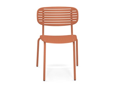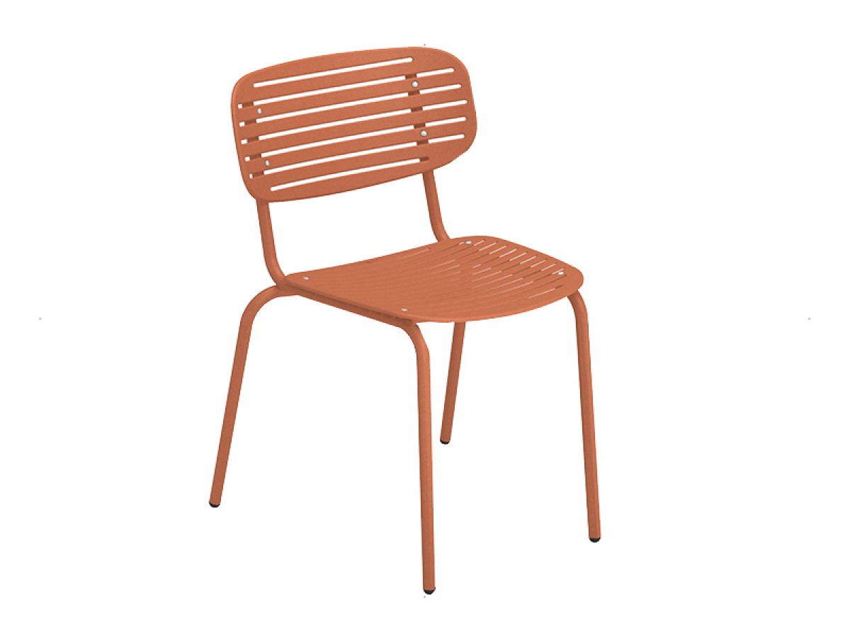 - Die Struktur besteht vollständig aus Fe360-Stahlrohr, während Sitz und Rückenlehne, die sich durch das auffällige grafische Design auszeichnen, aus tiefgezogenem verzinktem Stahlblech bestehen.