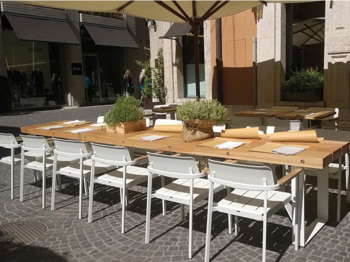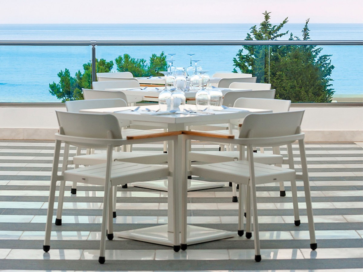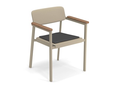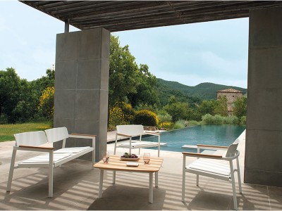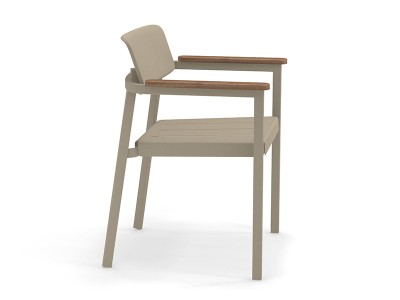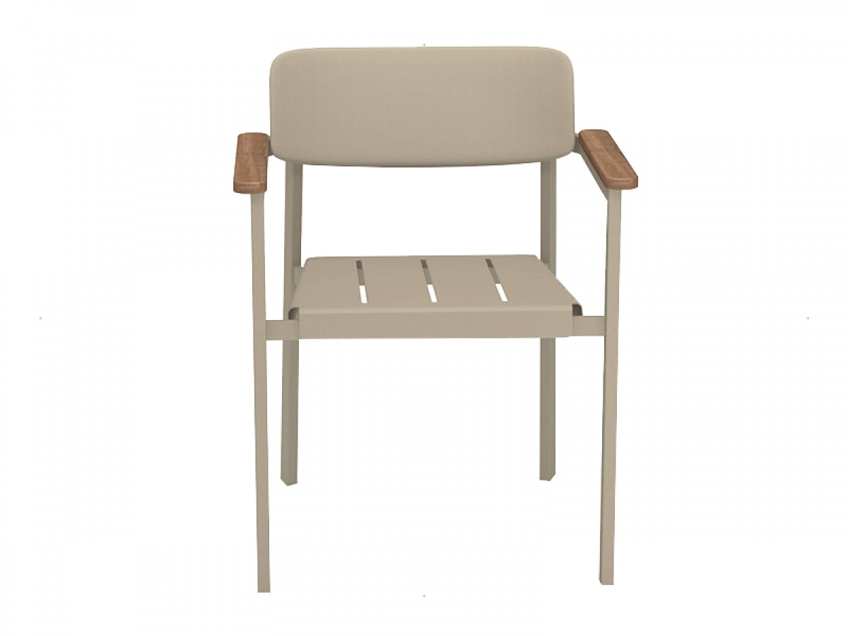 - Outdoor-Sessel mit Aluminiumgestell und Armlehnen aus Teakholz.