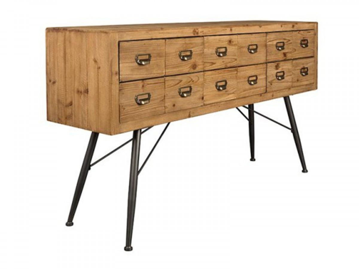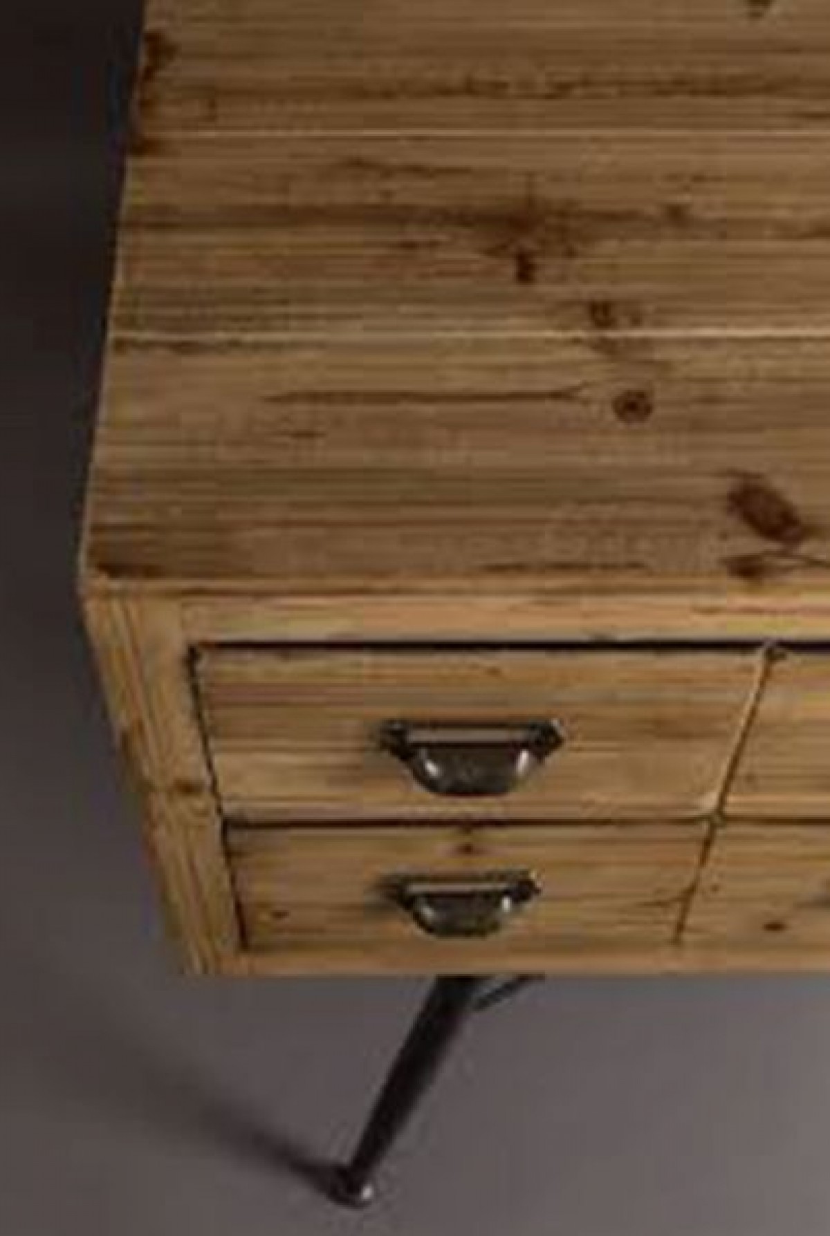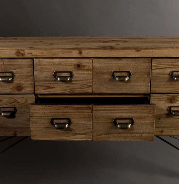 - Geteilte Schubladenfronten aus massivem Tannenholz mit Stahlgriffen