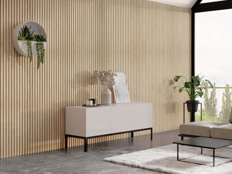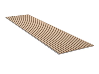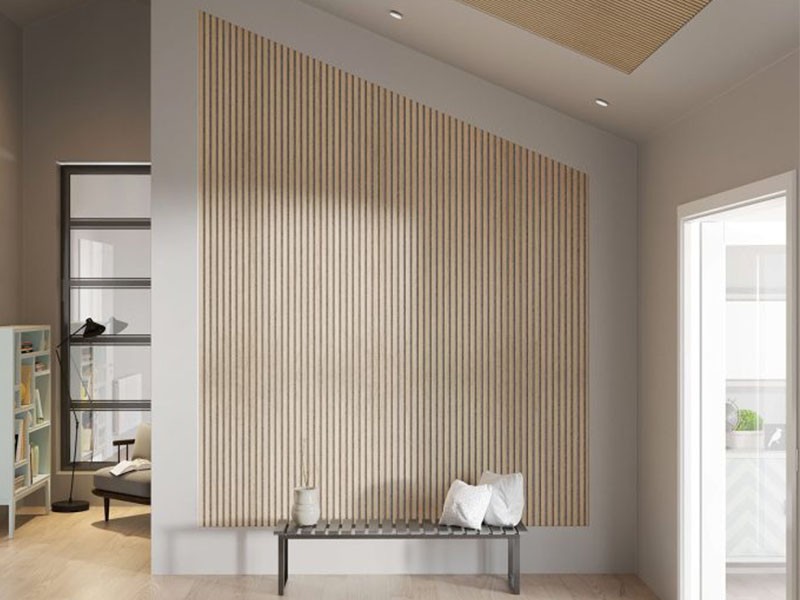 - Das Paneel kann verwendet werden, um schöne Lamellenwände und -decken zu schaffen, die dem Raum ein modernes Aussehen verleihen. Die Platte ist schallabsorbierend und entfernt Nachhall, was die Akustik im Raum drastisch verbessert;